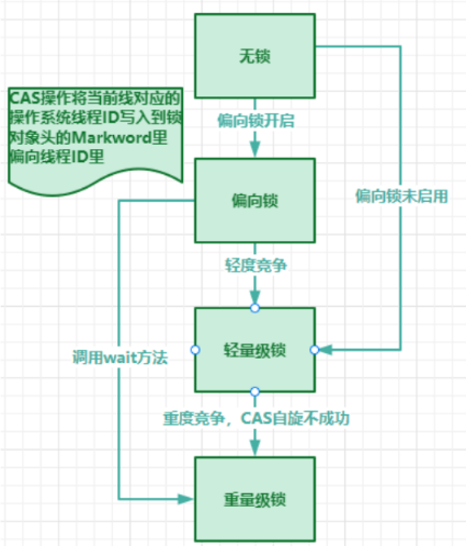 - 锁升级(无锁->(偏向锁->)轻量级锁->重量级锁)