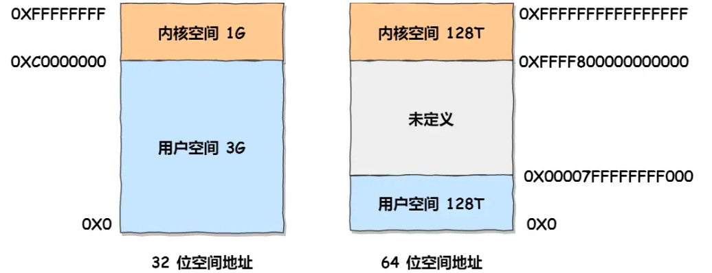 虚拟内存空间大小为2^32 或2^64 ,其中内核空间和用户空间使用的虚拟地址范围不同