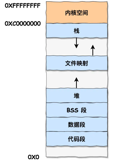 - 内存映射段(mmap,文件映射与匿名映射区) :内核将硬盘文件直接映射到内存,或进行匿名内存映射用于存放程序数据
