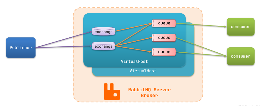 - Broker:即RabbitMQ的实体服务器。提供一种传输服务,维护一条从生产者到消费者的传输线路,保证消息数据能按照指定的方式传输。