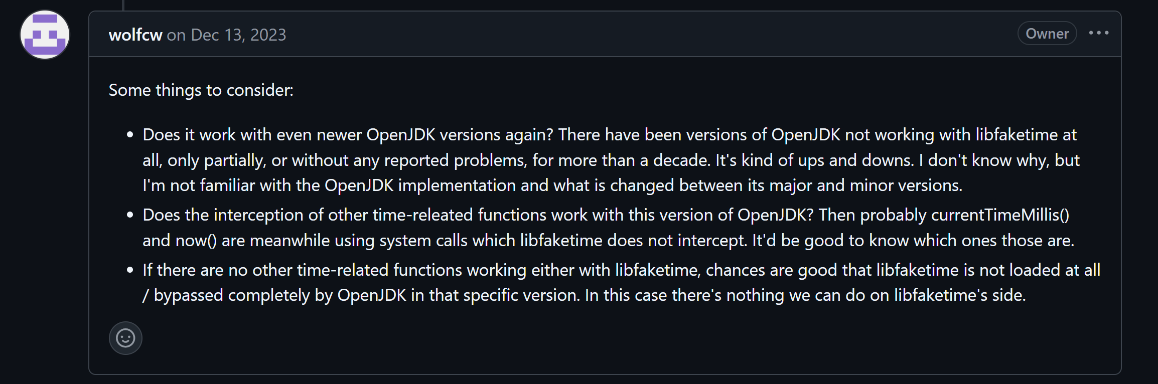 - 在libfaketime的issue逛了一圈,看看能不能借鉴前人智慧,发现作者曾说过有可能是jdk底层使用的函数,faketime不支持拦截